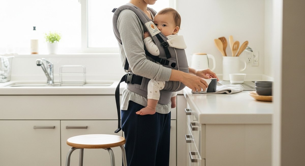 家事の動きを妨げないためには、赤ちゃんと親の体がどれだけ密着しているかが重要です。隙間があると、動くたびに赤ちゃんが揺れてしまい、それを支えるために親が不自然な力を入れることになります。赤ちゃんの背中が自然なCカーブを描き、足がM字に保たれた状態で、親の胸の高い位置に密着できるものを選んでください。
