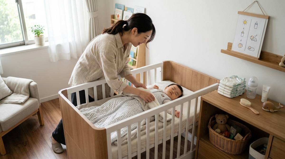 暗い部屋はメラトニンの分泌を促し、深い眠りをサポートする科学的な根拠に基づいた設定です。また、いつも同じ環境で寝かせることで、赤ちゃんにとってその場所が「安全で眠るための場所」であるという認識が定着していきます。