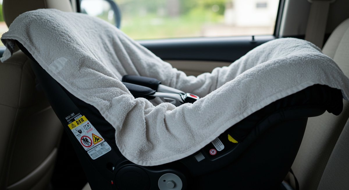 ベルトがタオルの上を通ると正しいホールドが得られないため、タオルはベルトラインから外す配置にします。具体的には、タオルを頭と首周りのみに置き、肩ベルトや股ベルトの通る位置は空けておきます。タオルの端をシートの隙間に差し込んでずれを防止しつつ、ベルト経路は確保してください。