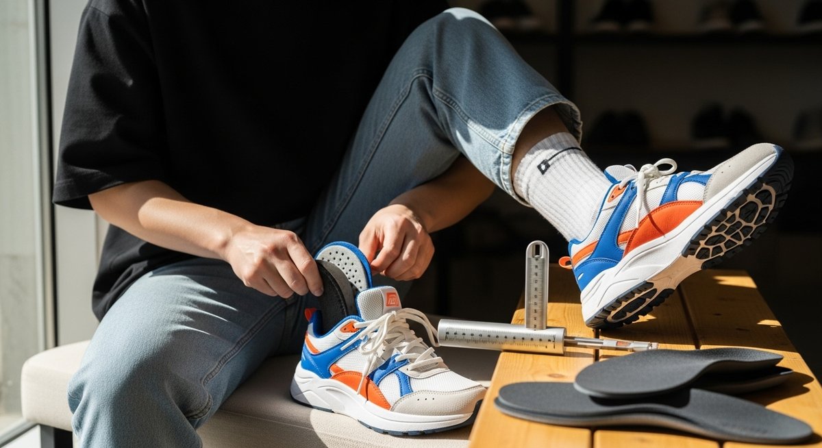 最も効果的なのが、インソール(中敷き)を追加する方法です。ニューバランスからは、純正の交換用インソールが販売されています。もともと入っているインソールの下にもう一枚、薄いインソールを重ねるだけで、靴の中の容積が減り、フィット感が増します。