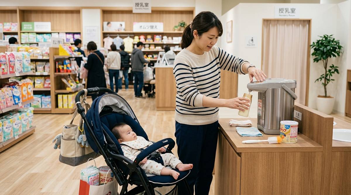イオンモールやららぽーとといった大型の商業施設、あるいは百貨店の中にテナントとして入っている西松屋であれば、お湯の心配はほとんど不要です。こうした施設には、施設全体で管理されている「赤ちゃん休憩室」や「授乳室」が必ずと言っていいほど完備されており、そこには調乳専用の浄水給湯器が設置されています。
