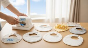 購入前に必ず確認したいのが、片手でもスムーズに着脱できるかどうかです。赤ちゃんを抱っこした状態で、サッと被れる、あるいは首にかけられる設計になっているかがポイントです。複雑なバックルやリボン結びが必要なタイプは、緊急時には扱いにくく、ストレスの原因になることがあります。