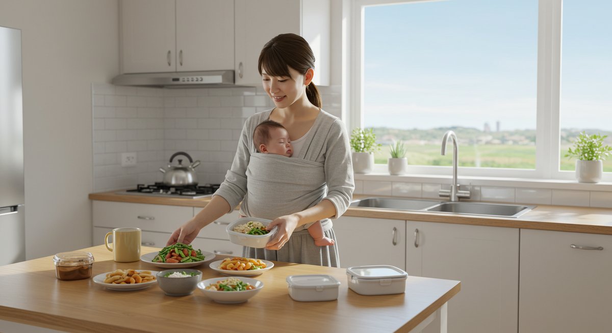 里帰りできない場合は、ワンオペでの負担軽減が重要です。まず優先するのは休息と簡単に準備できる栄養補給です。調理時間を短縮するために冷凍弁当やミールキットを定期的に取り入れましょう。