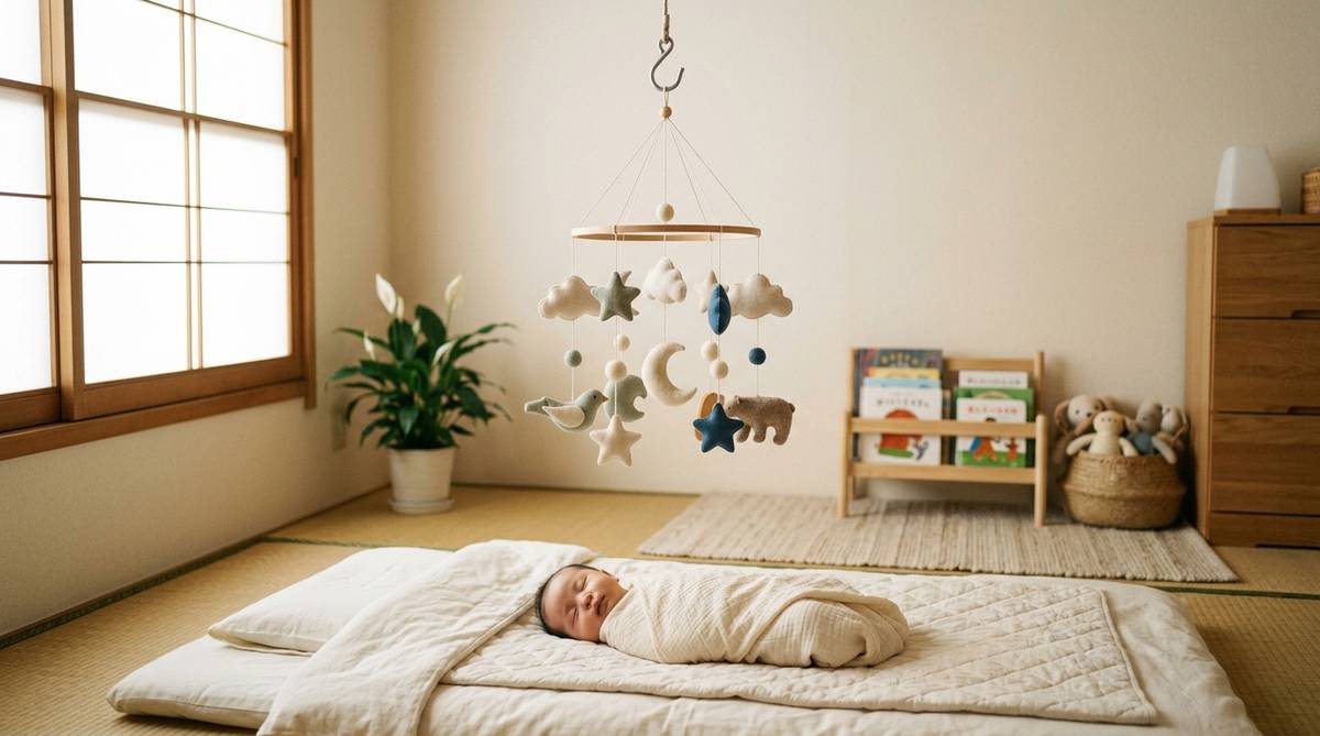 意外に知られていないのが、モビールの持つ「鎮静効果」です。ゆっくりと流れるような動きを眺めているうちに、赤ちゃんの呼吸が整い、穏やかな眠りへと誘われることがあります。